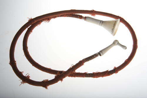 • A red textile tube has an ivory mouthpiece on one end and an earpiece on the other.